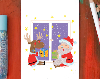Disegno della renna - Etsy Italia Babbo Natale e la Renna | Biglietto di auguri | Dimensione 10x15 cm | Stampa a colori su cartoncino | Retro bianco | Burabacio.